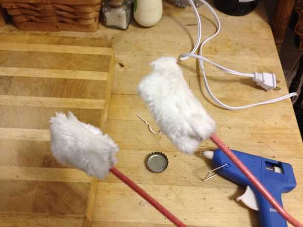 Doblar los extremos de las perchas en círculos y caliente-pegado algo de tela blanca a ellos (lo mismo que las patas están hechas de). Me enderezó las suspensiones y había recortado a la altura adecuada.
