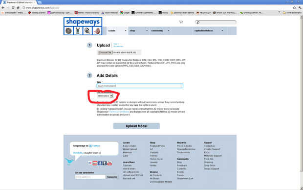 Si usted está teniendo problemas para subir a shapeways vuelva a comprobar el tamaño y luego lo repare utilizando studio netfabb (hay una versión gratuita). Aquí es una manera de utilizarlo.