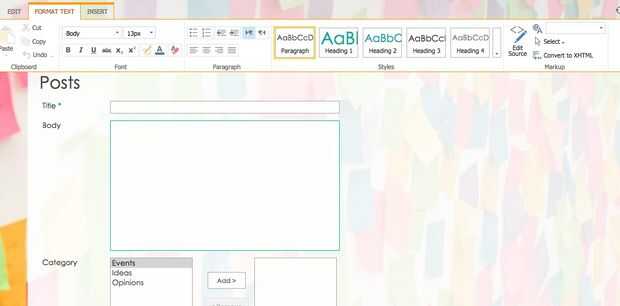 Ingresar texto en los campos "Título" y el "Cuerpo" y utilice la ficha aplicar formato al texto que está por encima de hacer cambios a su fuente, tamaño y color. Use la ficha Insertar para insertar un hipervínculo, cuadro o foto.