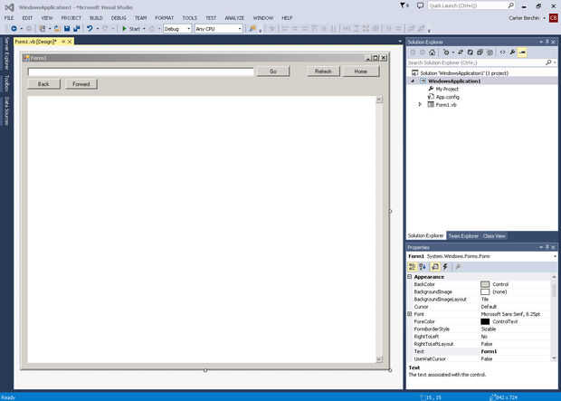 Im que va a enseñar cómo hacer un navegador web en Visual Basic 2005.Paso 1: a partir de Abierto Visual Basic y empezar una nueva aplicación de Windows.Paso 2: Agregar las herramientas de Añadir a:Cuadro de textoNavegador web5 botonesen ese orden.Pas