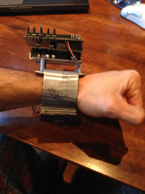 Pegamento, cinta o alguna manera fijar la batería a la banda de la muñeca. Usé pegamento gorila. Eso es fantástico.