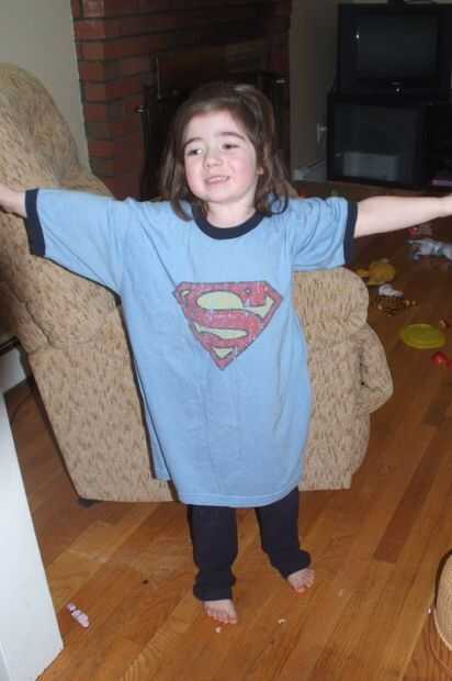 Que tu hijo pruebe en la camiseta. Asegúrese de que no se asusten del logo, o cree que es feo o que pica, o qué has. Esta es también tu oportunidad para comprobar la longitud, cuello y mangas. La duración será aproximadamente una pulgada más corta de lo que es ahora. Usted puede hacer tan corto como quieras, pero usted no puede hacer más. Las mangas serán la misma longitud que son ahora. Si el collar es muy grande, ver el último paso en este instructable, pero hacer el proyecto mucho más difícil. Mi consejo es elegir una camiseta diferente, o encontrar a un niño más grande.