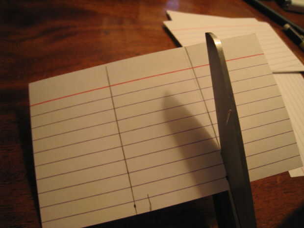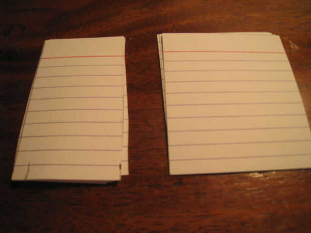 tengo algunas tarjetas de índice especial de 5'' x 3". Los funcionará mejor. 5 cartas le dará 15 si cortar en tercios (mini) o 10 si se corta en mitades (jumbo). Eligió uno de ellos y cortar las cartas. En la foto, os muestro las mitades y tercios.