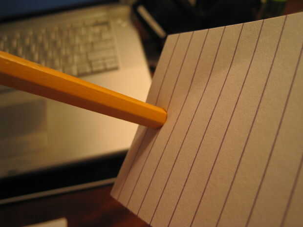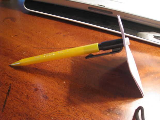 Bien, ahora toma la goma de borrar de lápiz mecánico. Alinee los orificios perforados en las tarjetas con la perforadora donde el borrador solía ser. Luego pegan el borrador a través de las tarjetas. Si no cabe, usted puede abrir el agujero con el frente del lápiz mecánico.