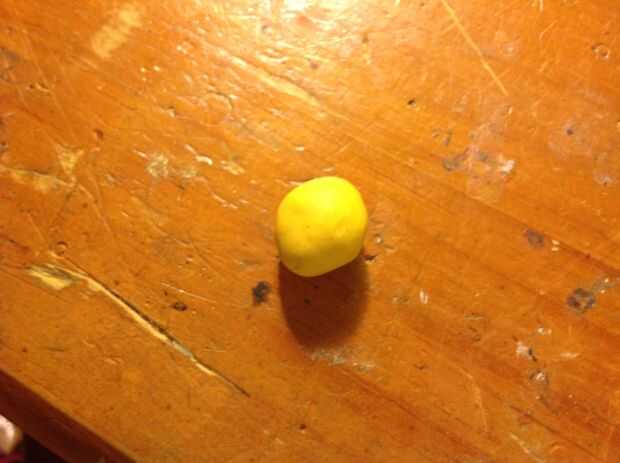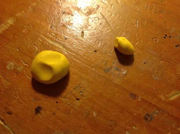 Tomar aproximadamente una quinta parte de la pieza de arcilla amarilla y póngala a un lado. Hacer la pieza más grande de arcilla amarilla dentro de una esfera y hacer que los extremos un poco afilados. Hacer la pieza más pequeña de arcilla y convertirla en un cuadrado de grueso un poco más grande que el ancho del extremo cónico de la esfera. Puso la plaza en un extremo de la esfera afilado, los bordes de la mezcla y alise la superficie de la arcilla.