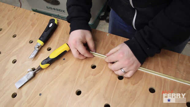 Usted necesitará algunos surcos espaciados uniformemente para los divisores a deslizamiento. Esto se puede hacer muchas formas, pero me la tabla para la tarea. No todo el mundo tiene un disco de moldurar listo para hacer surcos más amplia y en algunos países no están disponibles. No quería gastar un montón de tiempo en este proyecto así que hicimos un espaciador que era que el grosor de la tabla hoja de sierra, en este caso 1/8". Cortar aproximadamente una pulgada del extremo de esta pieza con un cincel afilado, podríamos entonces doble cara cinta adhesiva en el extremo. Esta parte iba a actuar como un tope frontal para cortar las ranuras de 1/4" mucho más fácil y sin un disco de moldurar.