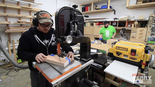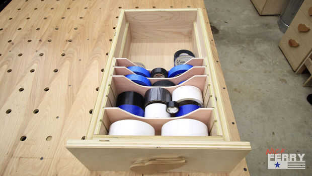 Corté unos insertos de tamaño final en la Sierra de mesa de medida para asegurarse de que encajaría entre los lados. Entonces Jay agregó un corte a cada uno en la Sierra de cinta. Esto facilita un poco agarrar cosas en el cajón. Entonces sólo tiene que insertar los divisores donde sea necesario.