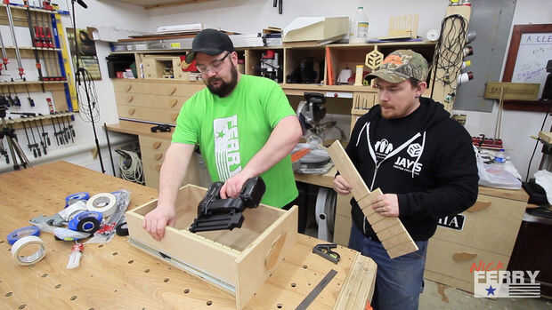 Lo bueno de este método es que realmente no es necesario garantizar las partes en el cajón. Los insertos de impiden que mover mucho. En mi caso tuve una clavadora en brazos lo disparé un clavo en cada una para garantizar que el lado del cajón.