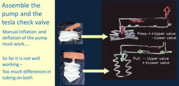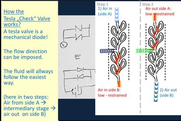 Infle la bomba que el aire fluirá preferrentielly de un segmento (los flujos de aire en Tesla un segmento - llamada A) se facilita y en otros restringida - el nombre B-). Pero una vez que la bomba está desinflada el papel de cada segmento de Tesla se invierte exactamente. El flujo de aire es facilitado en el segmento B y refrenado en segmento A.