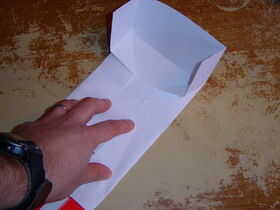 Desdoblar el pliegue anterior. Ahora, esta parte es complicada: Pliegue los extremos y hacen dos dobleces a 45 grados que forma la mitad de una caja.