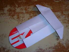 La parte de la caja que está parado para arriba y aplana trayéndolo hacia adelante, hacia nuestro doblez de referencia mientras que al mismo tiempo tirar hacia fuera en los lados de la caja. Esto formará dos aletas que tienen pliegues de ángulo de 45 grados. Las aletas deben cuelgue por los laterales del soporte cd.