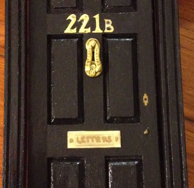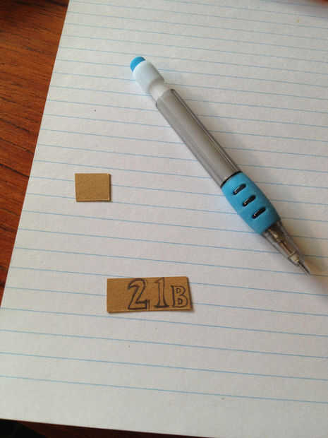 Extraer los números en papel cartulina y cortarlos con cuidado hacia fuera. Pintar con la pintura de oro (para igualar la aldaba) y dejar de lado que se seque. Recuerde, la B es más corto que los números. (Foto de referencia Sherlockology)