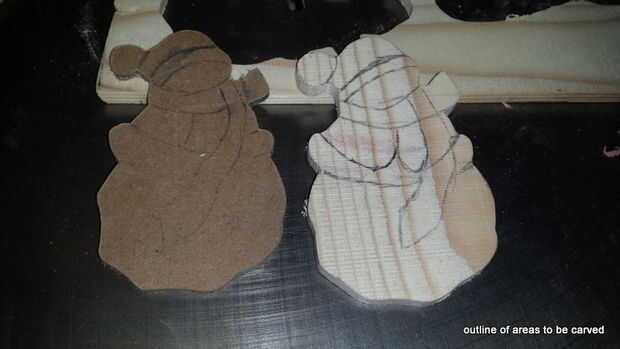 Como se puede ver en mi plantilla que he dibujado las líneas que necesito alivio tallar alrededor. Las marcas del esquema la conexión entre las bolas de nieve más grande y medianos, el chaleco, la bufanda y el sombrero. Esbozo de estas líneas en el ornamento de madera utilizando el patrón como guía. Porque estos son hechos a mano, la precisión no es importante solo Asegúrese de tener un conjunto similar de líneas de referencia.