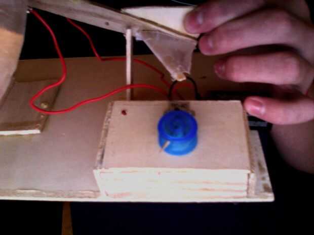 unir a la caja y pégalo a la base. tomar la tapa de la botella y haga un orificio en el lado. Enrosque un palillo corto a través del agujero y pégalo a la parte superior del potenciómetro