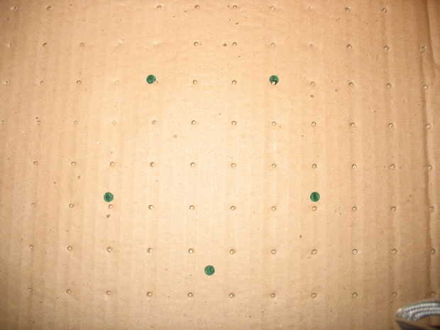 En el "top" de cada semi-ala completa, marcar puntos utilizando una plantilla. Hice mio en Paint Shop Pro e impreso en la tarjeta de stock que tenía práctica. Pentágonos son espacial, pero puede utilizar cualquier forma.