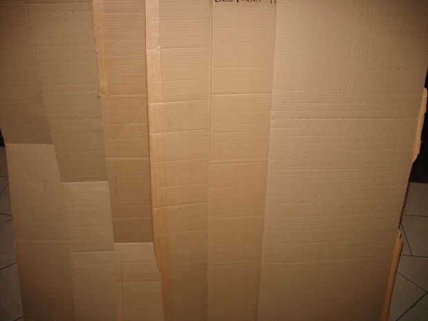 Corte rectángulos idénticamente tamaño 16 de una de las otras piezas grandes de cartón. Eran cerca de 16" de largo y 14" de ancho. Pero estas dimensiones están hasta usted.