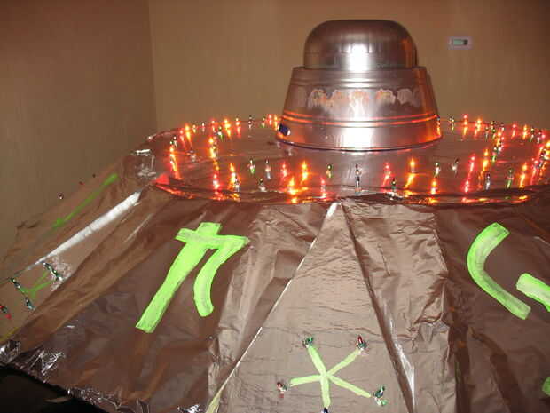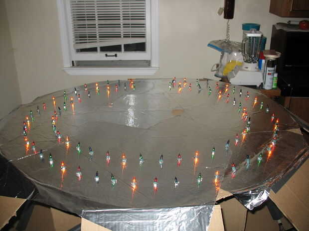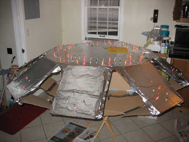 Adelante en este paso, empuje las luces a través de los orificios de la cubierta y las alas. El papel le ayudará a mantener en posición. Utilice los agujeros de paso que usted corta antes para correr los cables. También tuve que conducto cinta las luces en la parte inferior del OVNI en algunos lugares.