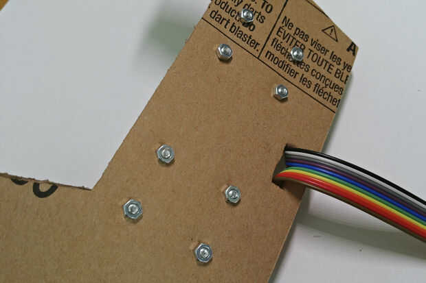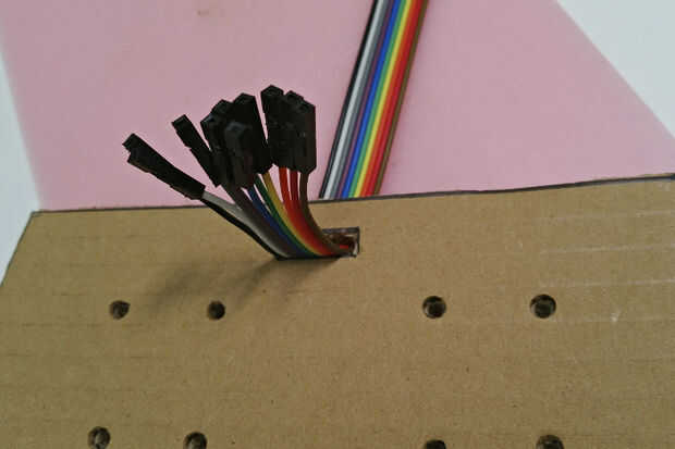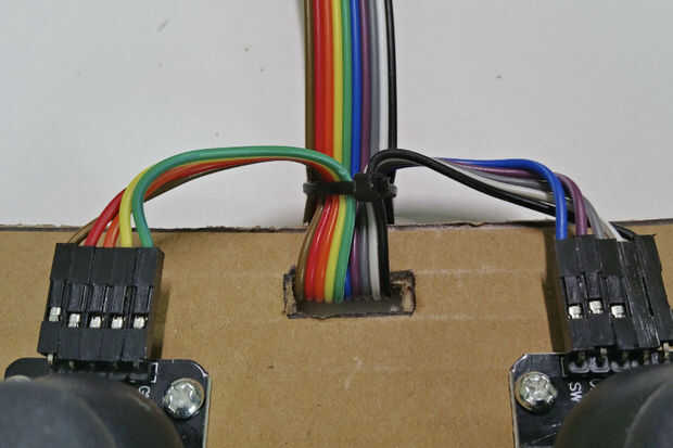 Ejecute 10pcs dupont cables a través de la ranura del cable. Monte dos módulos de la palanca de mando en el tablero con los pernos hacia arriba. En esta posición, los pasadores de X e Y se cambian por lo que hay que recordar cuando se está conectando los cables a la placa Arduino. Lazo el lazo de alambre en el cable para una protección adicional.