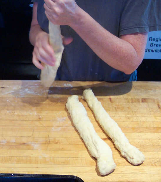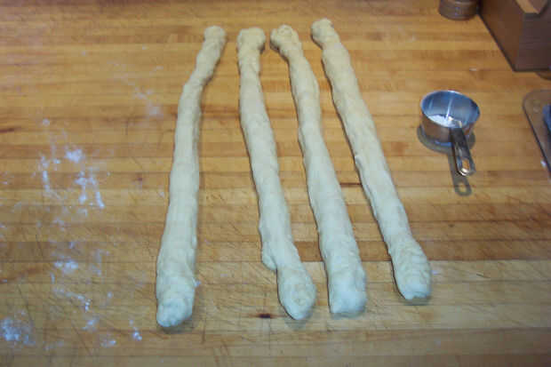 Tomar un trozo de masa y aplanar en forma de rectángulo rugoso. Con el cuchillo, cortar en cuatro filamentos largos. Extienda cada hilo a la longitud deseada y el espesor. (Cuanto mayor sea el pan, el más grueso y más largo el filamento.)