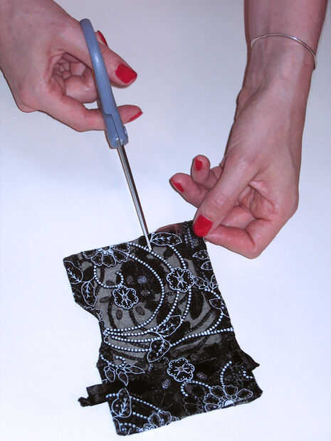 Avanzado: Si se es un profesional en tijeras puede cortar pequeños semicírculos en lugar de rendijas, siguiendo las instrucciones anteriores. Peligro! No hay mucho espacio para 4 medios círculos en la parte inferior de la bolsa así que empezar con poco y precisar mano Panty!