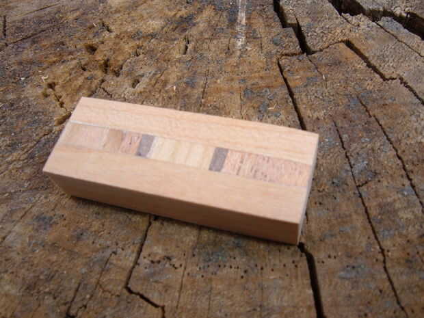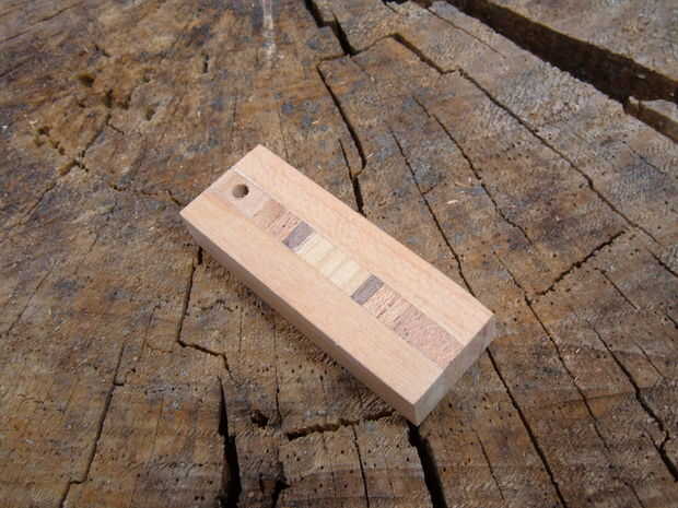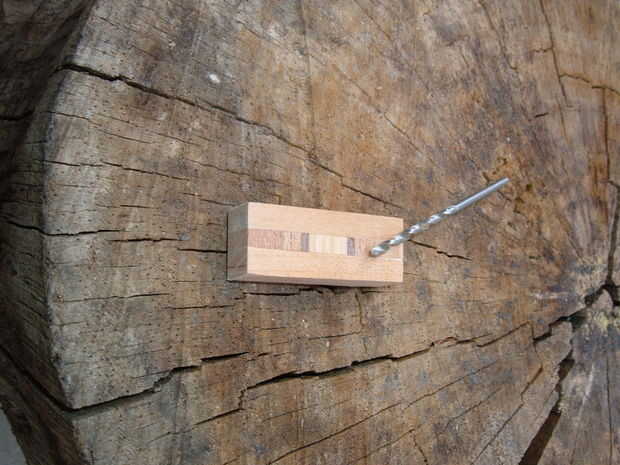 Ahora es el momento para perforar. Yo uso una mechas de 3/32". Me marcar un punto sobre 1/8" del borde y en medio de uno de los extremos de la pieza y un taladro. Perforar un trozo de madera, que mantiene la parte posterior de arrancarlas y protege tu mesa.