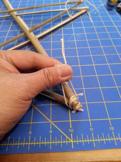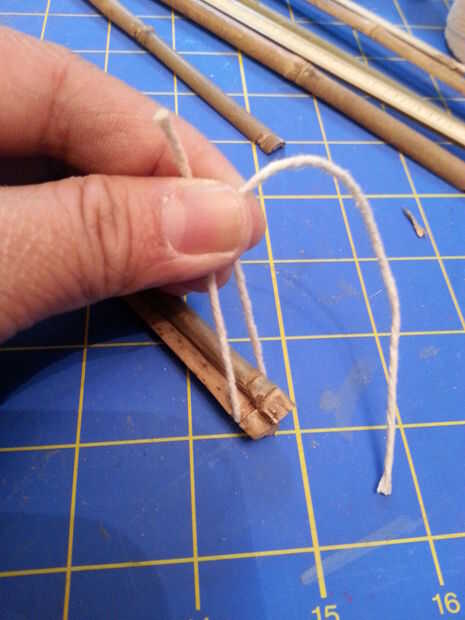 2. Cada palillo tiene una plana (cara interna del bambú) y un lado redondo (cara externa del bambú). Traer dos palillos junto con la parte externa (redondo) hacia la misma dirección. Atar los dos extremos junto con un trozo de cuerda. Una vez que está atada la cuerda, abrir el otro extremo de los palillos para formar un patrón de "V".