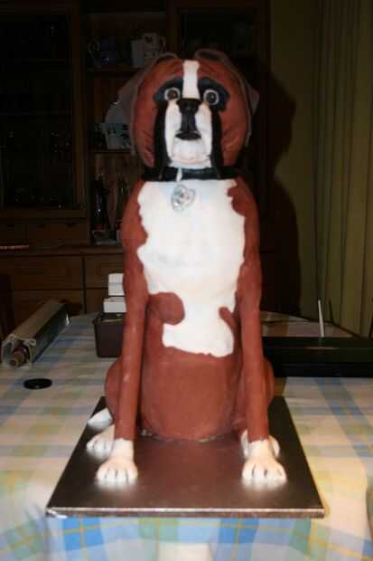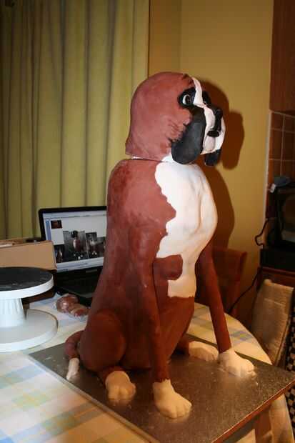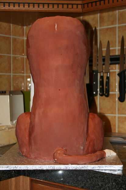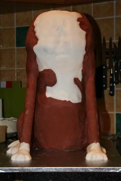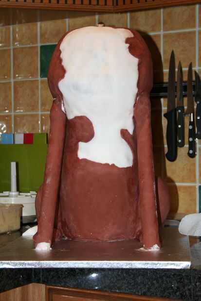Para terminar la torta hice un collar para rellenar y cubrir el pequeño espacio entre la cabeza y el cuerpo que luego pinté de negro. Entonces agarré un glaseado más marrón, amasada en algunos alimentos colorantes, principalmente marrón oscuro y negro un poco por lo que terminó con un icing de color marrón más oscuro, rodaron hacia fuera y cortan un par de orejas. Estos se dejaron para secar muy ligeramente así que tenían un poco de forma a ellos cuando até a la cabeza, estos fueron pegados en glaseado real un poco pero principalmente con agua.