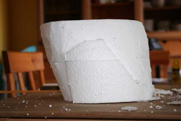 Usé un cuchillo de pan para tallar las tortas dummy, refiriéndose a los cuadros y pie de vuelta ocasionalmente hasta que estaba contento con la forma.