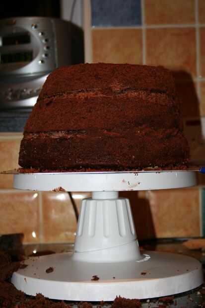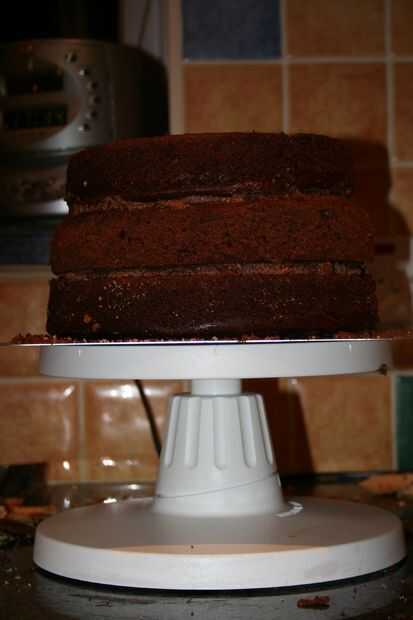 Al igual que con las tortas de vainilla, esto es sólo un caso de intercalando las tortas con crema de chocolate. Yo no atenerse el pastel a la Junta ya que será más fácil de montar y espigas si están separados.