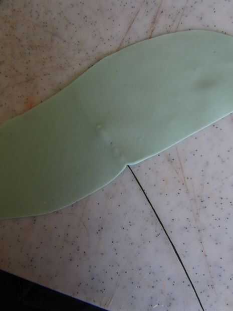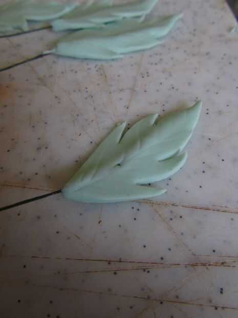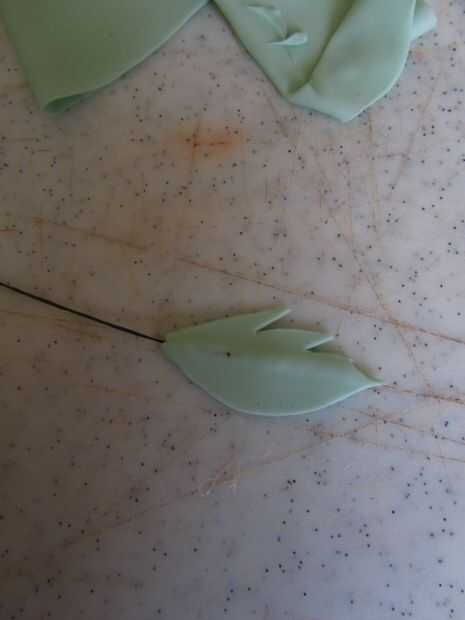 Para realizar las hojas estirar algunos verdes flowerpaste absolutamente fino, dejando un borde a la mitad. Tomar un alambre de 30 calibre, sumergirla en un poco de pegamento comestible y hogar cuidadosamente, colóquelo en la cresta. Cortar la hoja con un cuchillo o unas tijeras pequeñas. Alternativamente, usted puede comprar una gran variedad de cortadores de hoja en cualquier tienda de cakecraft.