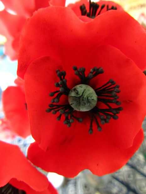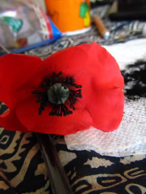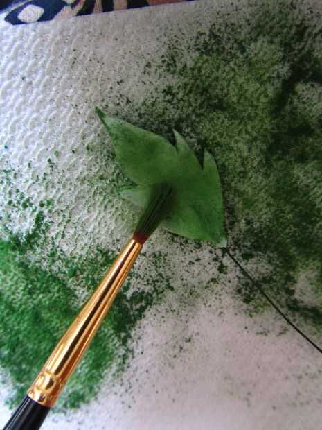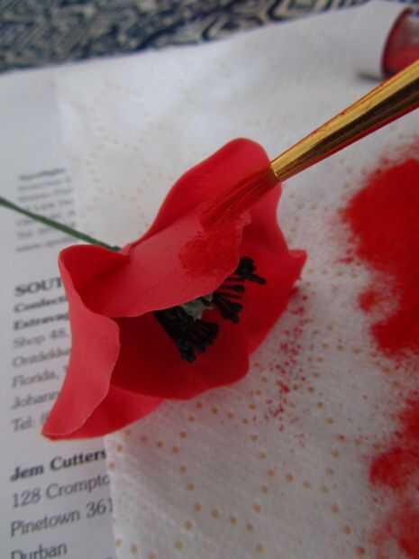 Cepille suavemente polvo de pétalo rojo todo los pétalos de la flor. Utilice polvo negro para añadir detalle al centro de las inflorescencias y la base de las hojas alrededor de los estambres. Use un polvo verde oscuro para las hojas.