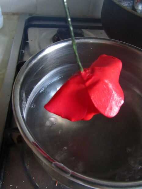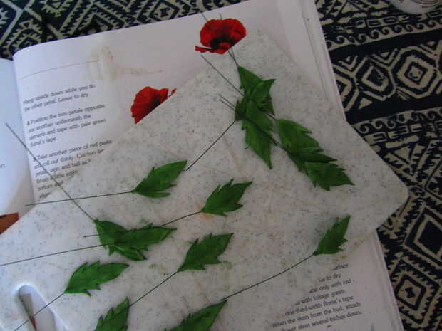 El polvo puede ser bastante desordenado, Cepille sus flores y marcar su torta si no se establece. Para definir el color, las flores de vapor. Hervir un poco de agua en una cacerola y mantenga las flores sobre el vapor uno a la vez durante unos segundos, hasta que tengan un brillo satinado. Cuelgue las flores a secar. Hacer lo mismo con las hojas.