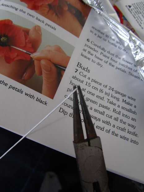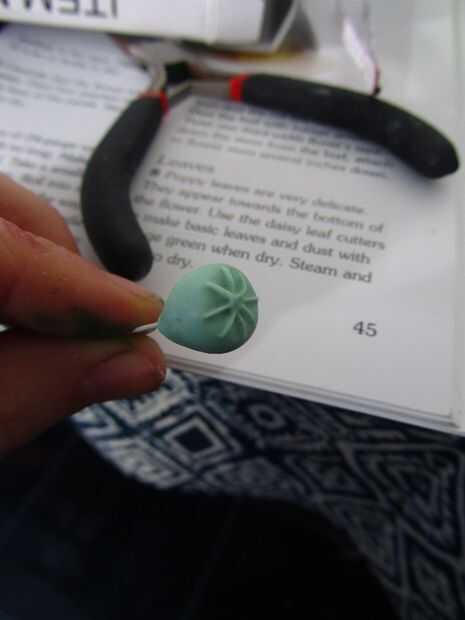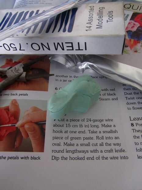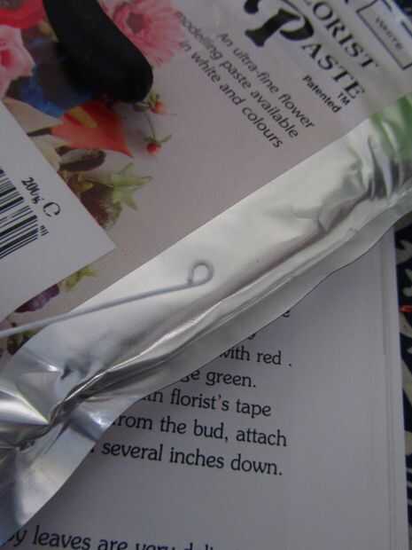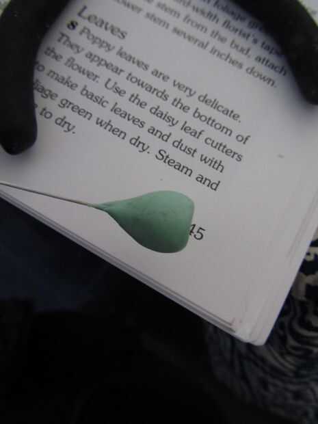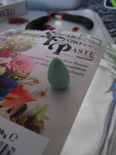 Tomar una pequeña bola de verde flowerpaste, aproximadamente la mitad un pulgada de diámetro y rodillo en un cono. Sumerja el extremo enganchado del cable en su pegamento comestible y luego inserte la punta del cono. Pellizcar la pasta alrededor del alambre para fijarlo y luego liso downn los lados y aplanar un poco la parte superior.
