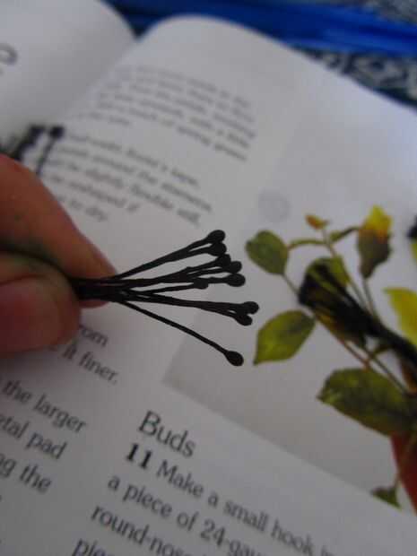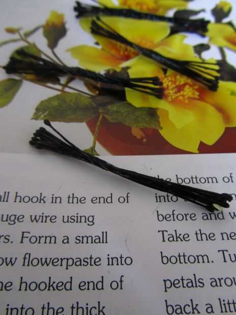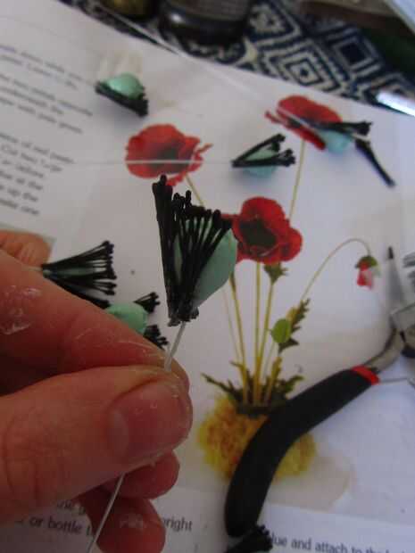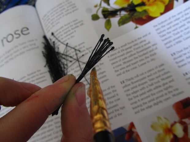 Ahora puede conectar los estambres. En este punto pegamento comestible probablemente no ser lo suficientemente fuerte, así que uso algún pegamento no tóxico como el PVA de alta pegajosidad. Para cada cuando necesita cuatro o cinco estambres pequeños racimos dispuestos uniformemente alrededor de la cabeza. Pegar los estambres en la base de la cabeza de la semilla, apretando el extremo apretado a la base y el cable para hacer que pegue.