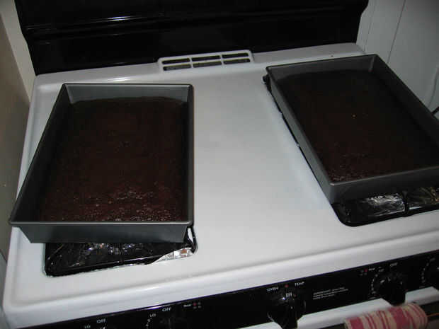 Aquí es la parte de las instrucciones donde volver al paso 3 y hacerlo todo otra vez a menos que tuvieras tres moldes para hornear. Debe tener tres tortas antes de que se puede proceder. Aquí están dos mío... se parecen a los calabozos de la bondad del chocolate. No quemaron aunque... son sólo chocolate.