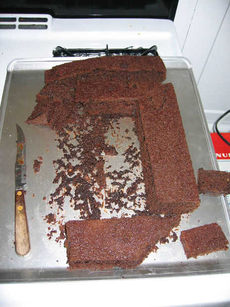 cómo hacer un pastel que parece la torta desde el final de Portal, el juego de video.  Éste es comestible y sin el menos de cosas sabrosas como pescado en forma de residuos sólidos en la receta original.  se trata de un pastel grande. cortar mina 9 p