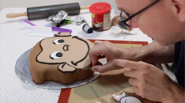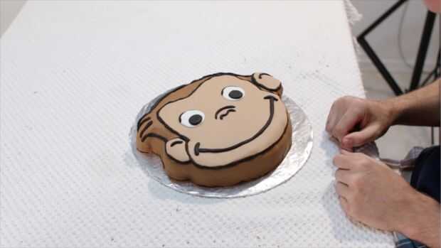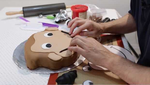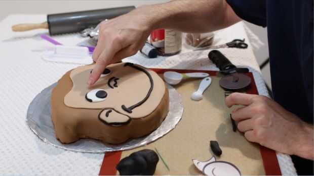 A continuación, utilizando fondant negro, extienda el pequeño piezas largas finas, utilizar para todos los contornos. Si es necesario, utilice un poco de glaseado como pegamento para mantener las tiras en su lugar, especialmente en el área de la barbilla. Ahora que terminaste! Es un poco tedioso, pero definitivamente vale la pena el tiempo!