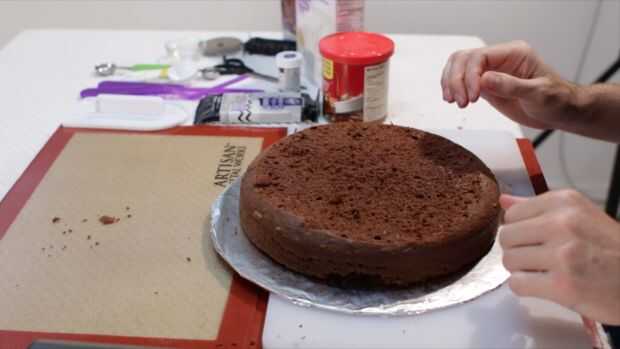 Ahora con un cuchillo de la torta, o un cuchillo de pan, corte la parte superior con montículos del pastel, nivelando hacia fuera.