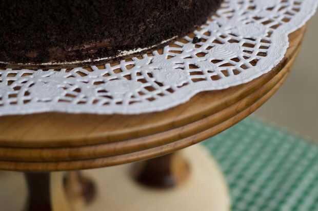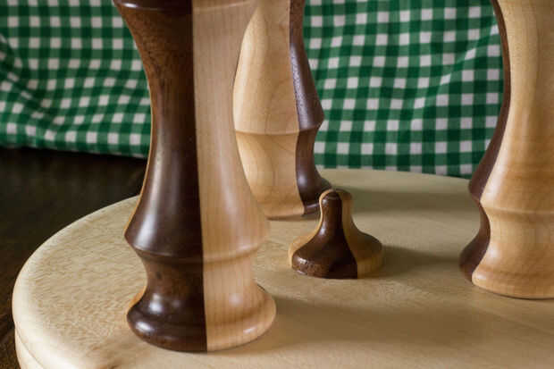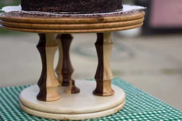 Tiene una tapa cereza, arce y nogal patas y un arce base. Se acaba con claro semi-gloss de polycrylic a base de agua así que nada mojado debe sentarse directamente en el plato, aunque no duele el acabado si algún glaseado o algo cae sobre él. simplemente Limpie con un trapo húmedo y lo seque. Cera antes y después de cada uso, para protegerla durante años.