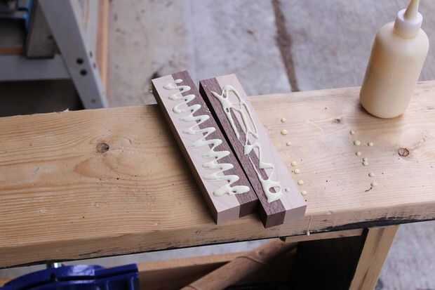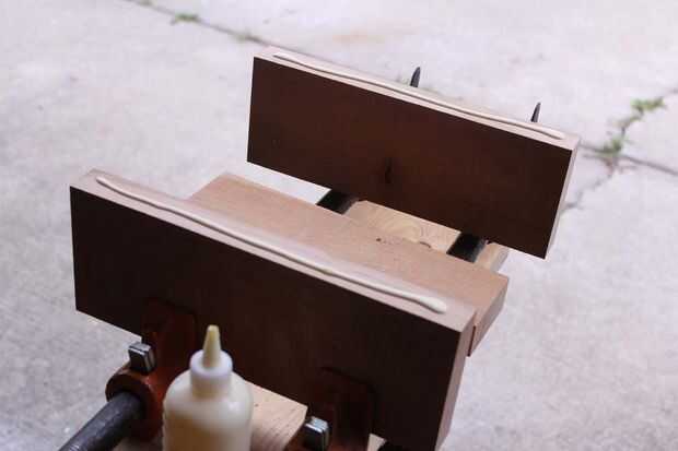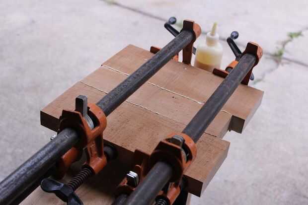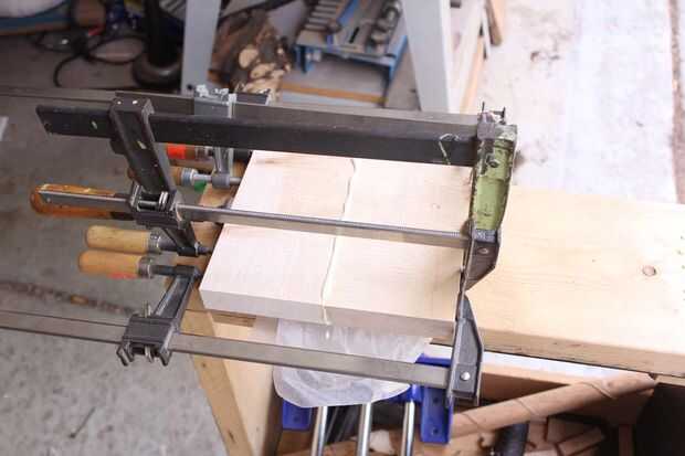 Pegué el plato cereza primero. Utilice cola amplia y no apriete las abrazaderas demasiado como corre el riesgo de apretar la cola de la Unión. Un pegamento adecuado borde será más fuerte que la madera real. En casi todos los casos la madera se romperá antes de que el empalme del pegamento falla.