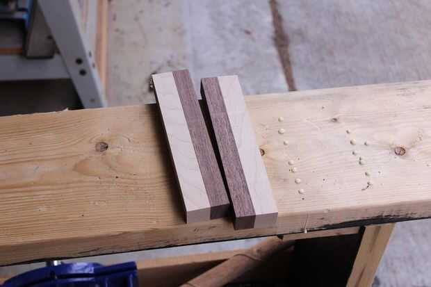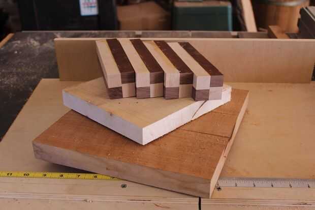 Por último usted necesita 3 espacios en blanco del huso para la patas de 2 "X 2" X 7 ". Tuve algunas ramitas de arce y nogal ya pegados encima de un proyecto fallido. Yo simplemente corte a tamaño.