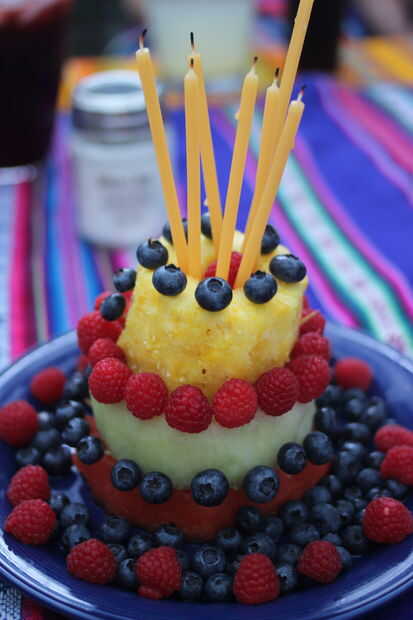 4. ahora para la baya de guarniciones: hacer un círculo de palillos que se pega directamente fuera de la "torta" entre cada capa de fruta. Añadir un círculo de arándanos a la capa inferior, un círculo de frambuesas en la capa media y otro círculo de arándanos en la parte superior, cada uno sostenido por un solo palillo de dientes.