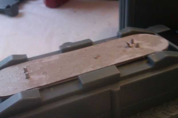 Apague en pegamento y luego colocar un trozo de cartón del patín de la forma de un dedo (hacia fuera de la línea corta un deck tech)