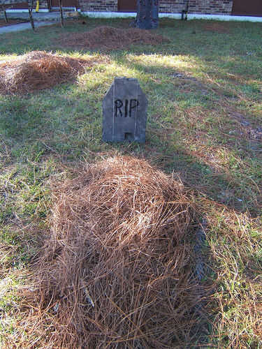 Para la lápida de "piedra" rompí uno de los largos 2x4s de espuma de poliestireno en longitudes de 2', los pegados junto con clavos, pintados RIP muy cerca, entonces mantienen la lata más lejos detrás para hacer el gris de la mirada de espuma. Una vez más, unas estacas afiladas del martillo con clavos que sobresalen en la parte superior en la tierra, después pegue la piedra de la tumba a estos. Si las uñas no unir las cuatro piezas bien poco de cinta de embalaje antes de que la pintura puede mantenerlos juntos un poco más.
