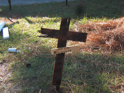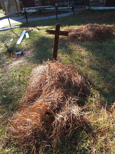 Un poco puntiagudo de madera y martillo en el suelo con un pie expuesto sobre la tierra y juntos clavo una cruz de cinta o clavo a ella. Pintura de aerosol para llevarlo todo a un color común. Hice un pequeño cartel para colgar de la Cruz y clavado una estaca en la pila para completar el look.