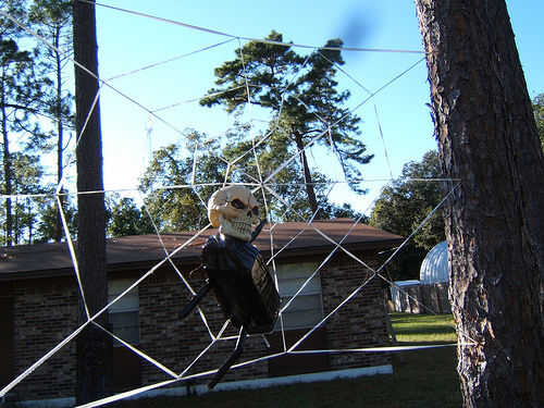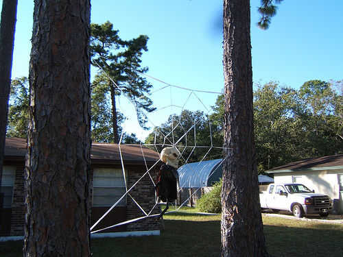 Clavar un clavo en el árbol en un buen ángulo, ate un lazo en el primer extremo de la cuerda y engancharla en el clavo. Martillo el clavo con la cuerda en él abajo de plano en el árbol. Cadena de la línea para el siguiente árbol y hacerlo otra vez, asegurándose de poner tensión en la línea, esto apoyará mucho el peso en la web y no quiere ceder. Ponerla en diagonal y adjuntar al árbol, luego volver a hacer la línea de fondo.