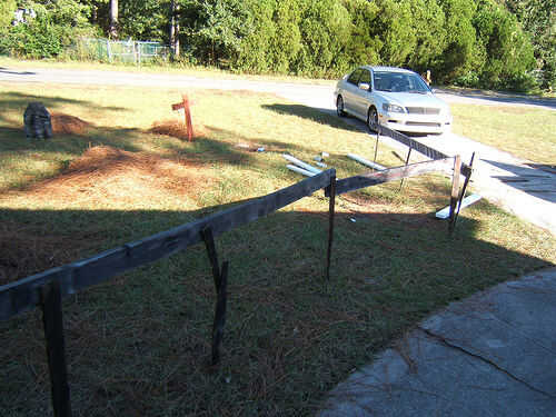 El primer paso es romper los palets. Los tablones de la plataforma luego se rompen algunos al intentar mantener a toda su longitud para que se vean un poco destartalado y darles un final puntiagudo para clavar en la tierra. Entonces clavo un clavo en la parte superior de cada puesto de listón y martillee firmemente en el suelo. Asegúrese de guardar espacio para caminar alrededor de los vehículos. Pegue la espuma 2x4s a los clavos expuestos y pintar la cerca entera. Tenga en cuenta el más pesado pone en la pintura de aerosol de la espuma más a comer, para no ir por la borda. Se puede utilizar para que se vea algo podrido aunque. También puede atar la espuma a las tablas para evitar que el viento vuele de los clavos.