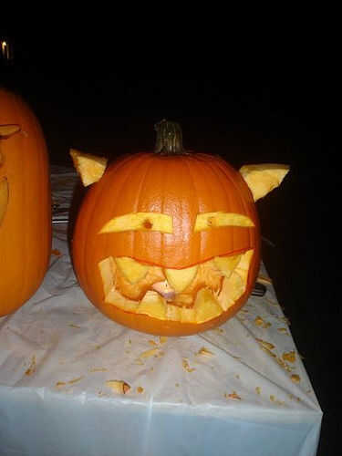 Para aquellos desafortunados que nunca han hecho uno, utilice un cuchillo para cortar una "tapa" alrededor del tallo, usar una cuchara para sacar todos los bits de semilla baboso lleno (se pueden cocer al horno las semillas de snackage), a continuación, utilice un cuchillo para tallar la cara en él. Pop una pequeña vela en conjunto en el porche.