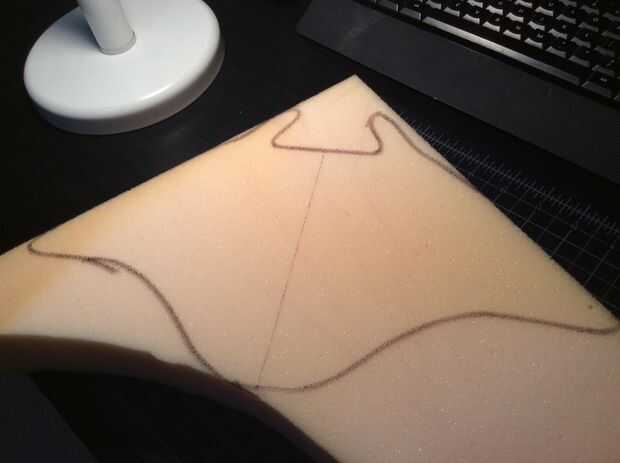 Me gusta darme una plantilla antes de cortar la espuma por dibujar formas para los frontales, laterales y parte superior de la espuma. Esto fue bastante fácil Considerando que manta rayas son bastante planas y no tienen extremidades. Para formas más complejas, a veces es una buena idea para romper en partes distintas como extremidades o colas y pin o les pegan más tarde. Si su forma es simétrica, trace una línea por el medio y ahorrarse algo de tiempo en los próximos pasos. Si está utilizando hojas de espuma o no tiene un bloque lo suficientemente grande, recomiendo usar cemento de contacto para unir varios trozos. También puede hacerlo para solucionar los errores hechos durante la fase de la escultura.