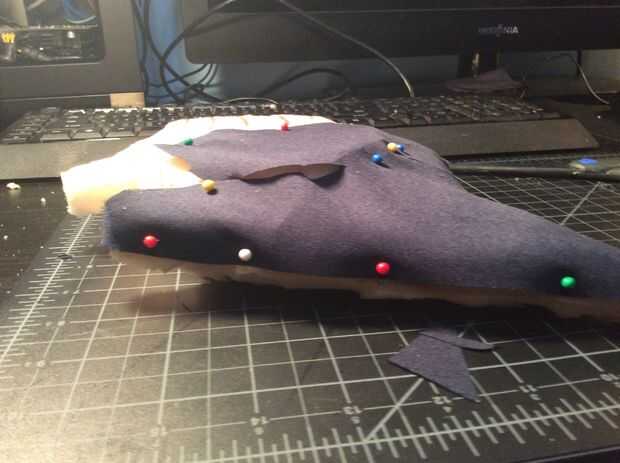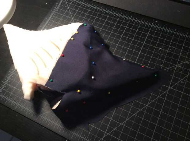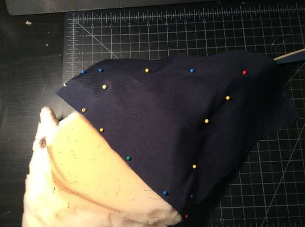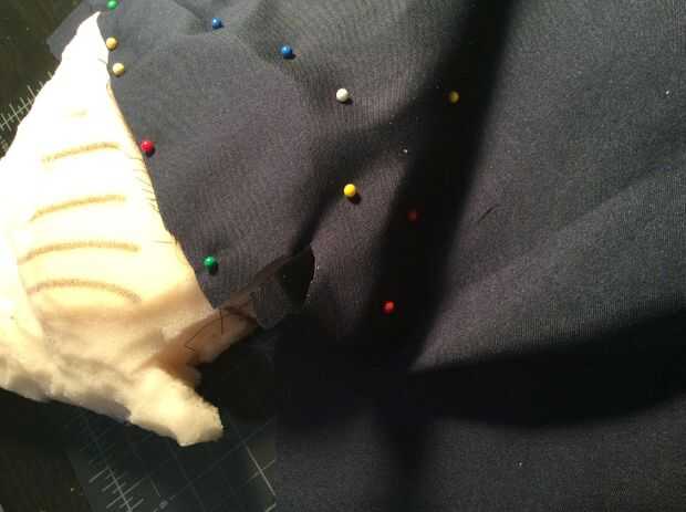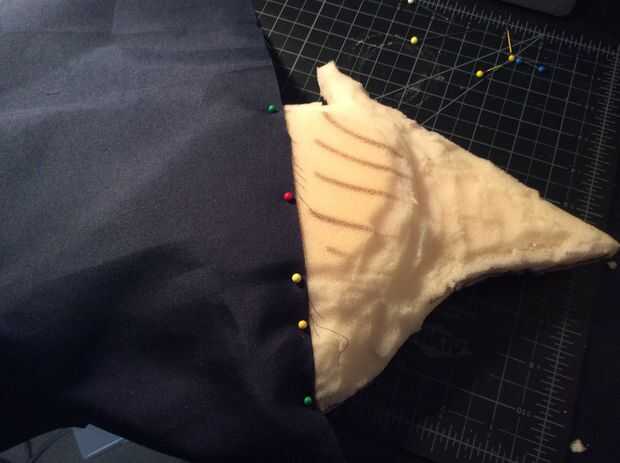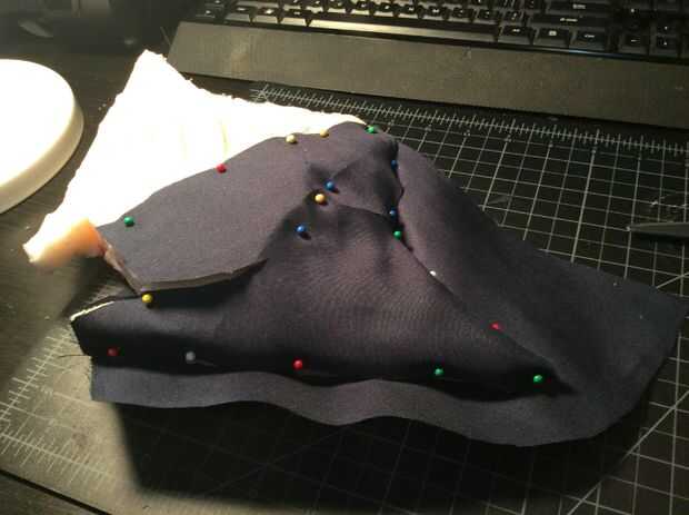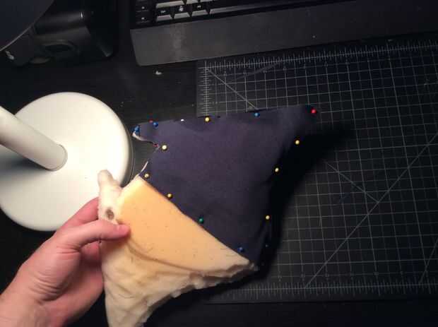 A este paso, me gusta empezar con mi línea de simetría, o con la parte más grande de la espuma que esculpir puede ser cubierto sin cualquier pellizcar o plegable. Si la escultura es simétrica, sólo debe cubrir y perno de un lado. Usted puede entonces sólo espejo su patrón más adelante. Asegúrese de que usas a una tela que se comporta de manera similar a la tela final en lo que va. Utilice pernos para fijar a la tela a la espuma mientras empuja las arrugas en los bordes. Sobre superficies curvas donde la tela se pliegue o arruga en sí mismo, pinzar a la tela en pliegues como pocos como sea posible y precisar para que se peguen hacia fuera. Cuando has cubierto y cubrió a la escultura toda, cortar estos pliegues cerca de la espuma. Estas serán las costuras que darán forma a tu tejido.